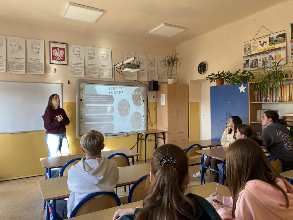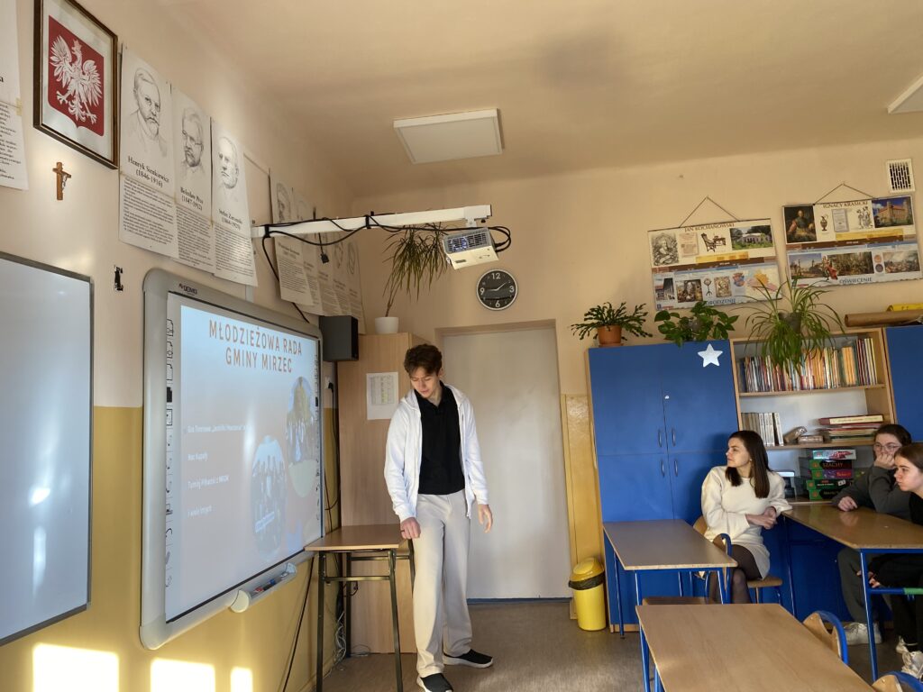 W szkole odbyło się spotkanie dla uczniów klasy VIII, które poprowadzili przedstawiciele Stowarzyszenia Step to Europe oraz radni Młodzieżowej Rady Gminy Mirzec. Młodzież poznała założenia projektu „Akcja: Gmina MYrzec!”, dowiedziała się, czym jest aktywność obywatelska i jakie ma możliwości działania na rzecz swojej społeczności. Była też przestrzeń na rozmowę, wymianę pomysłów i refleksję nad tym, co jest mocą lokalnej społeczności.